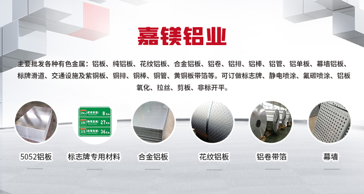 嘉鎂鋁業(yè)(上海)有限公司主要批發(fā)各種有色金屬:鋁板、純鋁板、花紋鋁板、合金鋁板、鋁卷、鋁排、鋁棒、鋁管、鋁單板、幕墻鋁板、標(biāo)牌滑道、交通設(shè)施及紫銅板、銅排、銅棒、銅管、黃銅板帶箔等。可訂做標(biāo)志牌、靜電噴涂、氟碳噴涂、鋁板氧化、拉絲、剪板、非標(biāo)開平。公司的優(yōu)質(zhì)產(chǎn)品在多個(gè)行業(yè)中均有發(fā)揮優(yōu)良的性能,表現(xiàn)極佳,廣泛應(yīng)用于航空、汽車、船務(wù)、電子、醫(yī)療等行業(yè)...